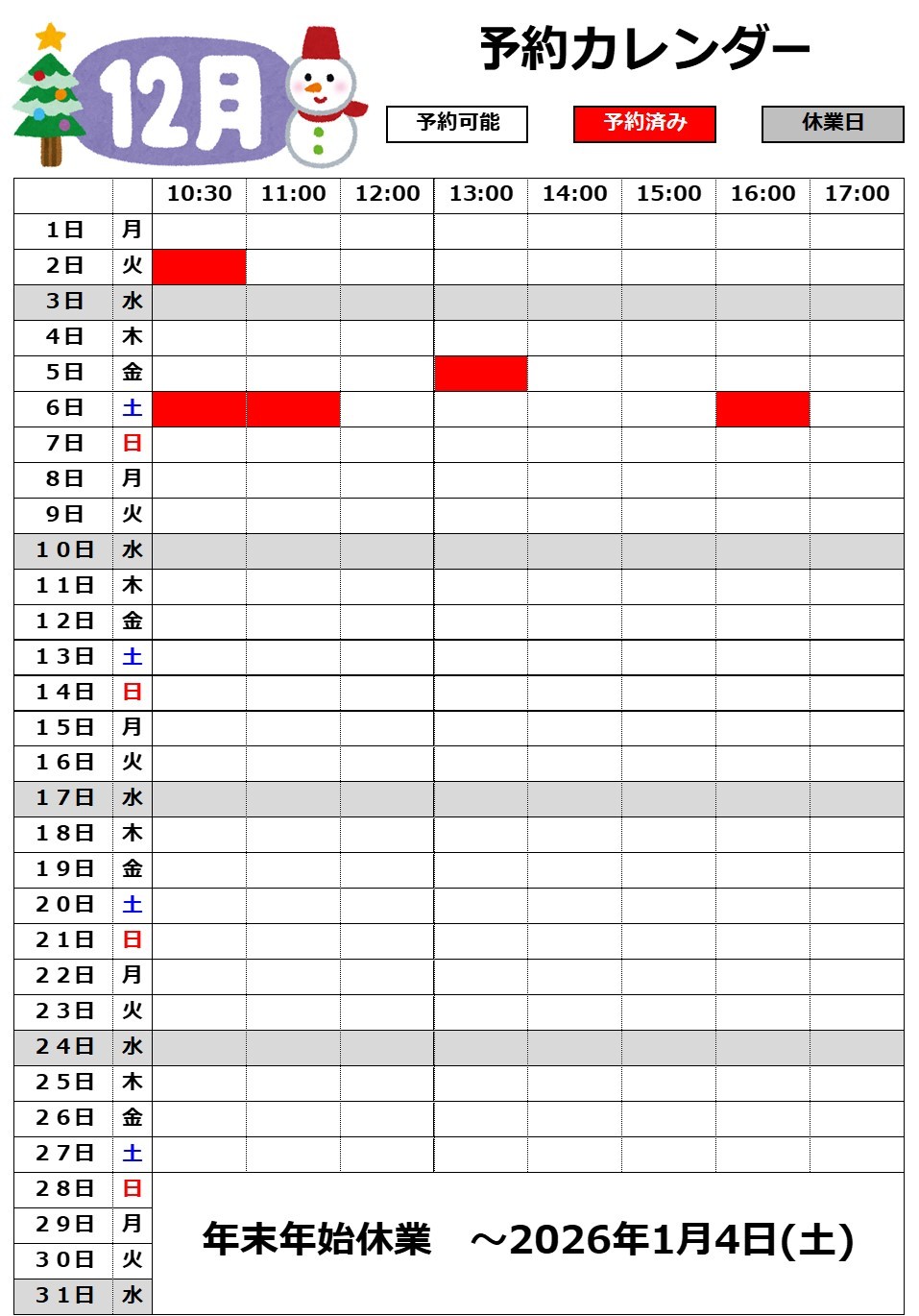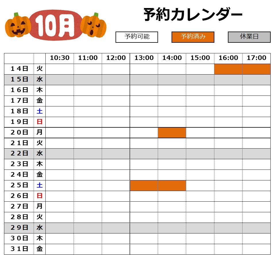 10月14日12:00現在 予約状況 ポスト 2025年10月14日 現在の予約状況です。 1週間前と比べ少し予約が増えてきました。 まだまだ予約枠の空きは多くありますが、 気温が下がるとどんどん埋まっていきますのでお早めに! お電話でもご予約は受け付けておりますが、 定休日、営業時間外でもご予約可能なWEB予約もご利用ください。 担当:柴﨑
