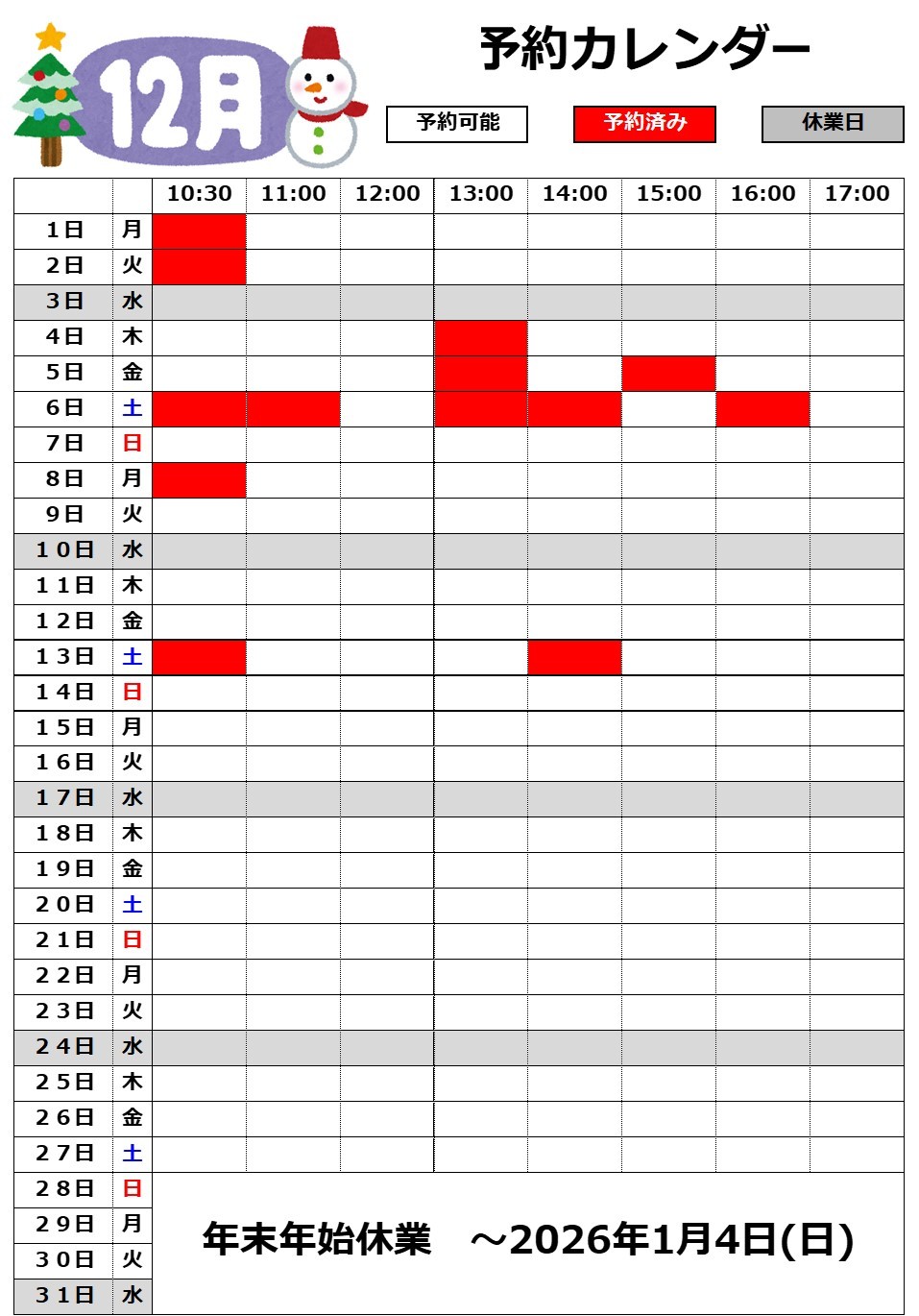 11月4日 16:00現在 予約状況 ポスト 2025年11月4日 現在の予約状況です。 週末を中心に予約をいただいております。 先日、長野県内の標高の高いところでは 積雪も観測されています。 もう冬は目前です! 早めの交換で安心、安全! ご予約はお早めに! お電話でもご予約は受け付けておりますが、 定休日、営業時間外でもご予約可能なWEB予約もご利用ください。 担当:柴﨑