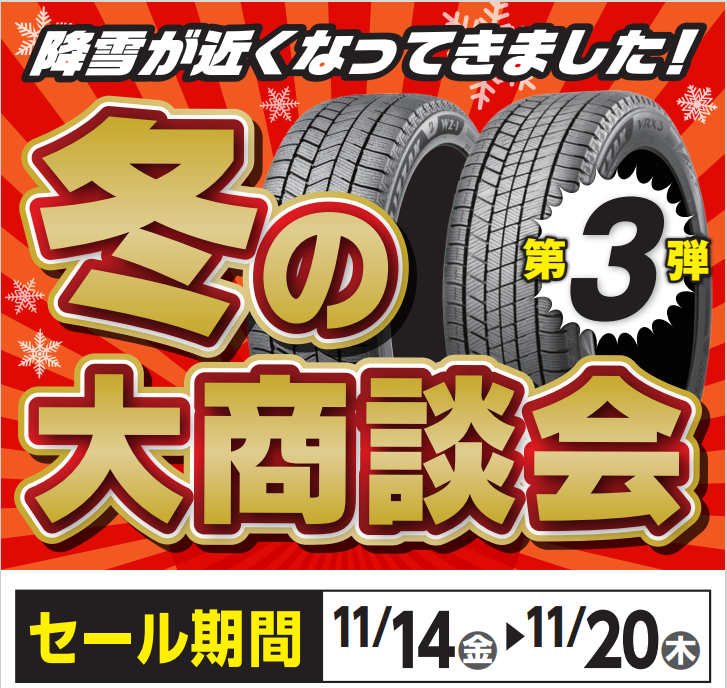 冬の大商談会 第3弾 開催中です! ポスト 2025年11月16日 皆さんこんにちは!タイヤ館千曲です! 11月14日(金)~11月20日(木)まで 冬の大商談会 第3弾を開催しています! タイヤ館千曲ではタイヤメンテナンス保管を 半期基本料金を先着30名様限定半額キャンペーン実施中! 「タイヤの置き場所がない」「積み下ろしが大変」という方が いらっしゃいましたらぜひご検討ください! 他にも数量限定品など、目玉商品もありますので スタッドレスタイヤをご検討中の方は、 ぜひタイヤ館千曲までお越しください! 担当:三井