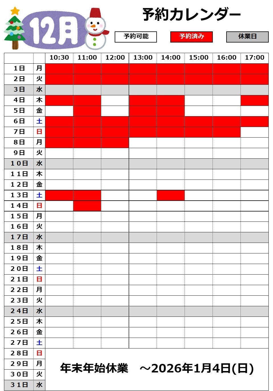11月27日 18:00現在 予約状況 ポスト 2025年11月27日 現在の予約状況です。 11月の予約は全て埋まっております! 予約が埋まっている日も当日受付可能です。 順番での作業になるのでお時間に余裕をもって お越しください。 12月も上旬を中心に埋まってきております。 ご予約はお早めに! お電話でもご予約は受け付けておりますが、 定休日、営業時間外でもご予約可能なWEB予約もご利用ください。 担当:柴崎