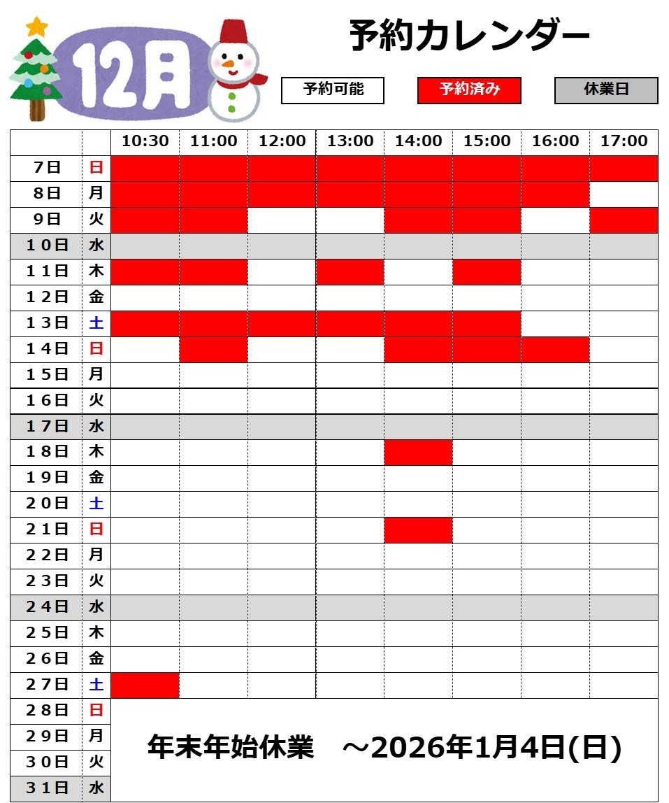 12月6日16:00現在 予約状況 ポスト 2025年12月6日 現在の予約状況です。 月曜日以降は予約枠に空きがあります。 4日、5日と雪が降りました。 今回は道路に積もりませんでしたが 次は道路に積もるかもしれません。 タイヤ交換がこれからの方はお早めに! 担当:柴﨑