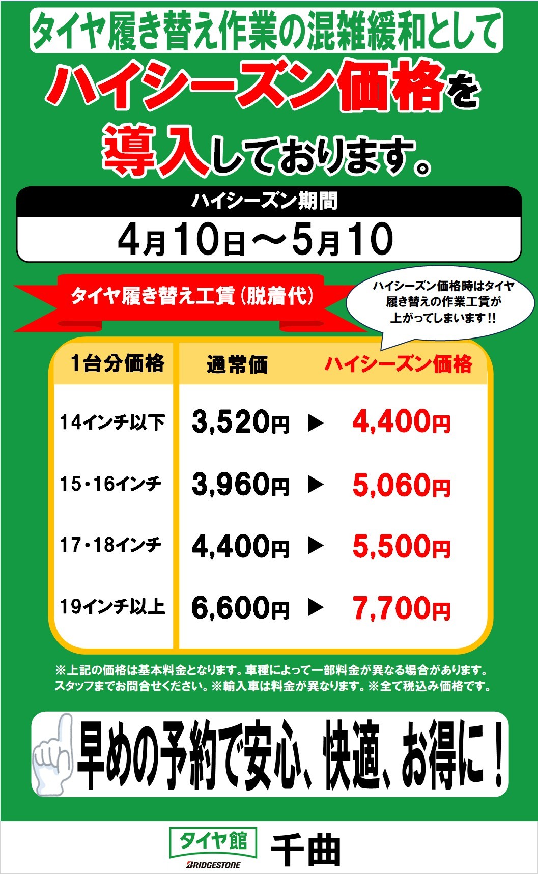 スタッドレスタイヤへの交換同様、4月10日~5月10日までハイシーズン価格となります。