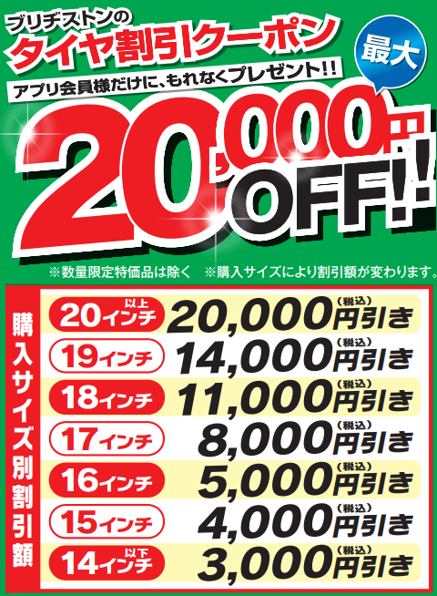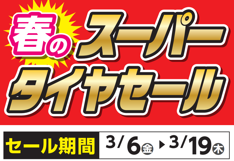 春のスーパータイヤセール! ポスト 2026年3月6日 3月6日(金)~3月19日(木)まで春のスーパータイヤセール開催です! タイヤ館アプリに新規ご登録いただくと 最大20,000円引きのクーポンが使えるお得なチャンスです! ご来店当日、アプリ会員ご入会のお客様もご利用可能です! 他にも数量限定品など、目玉商品もありますので 夏タイヤをご検討中の方は、 ぜひ当店までお越しください! 担当:柴﨑