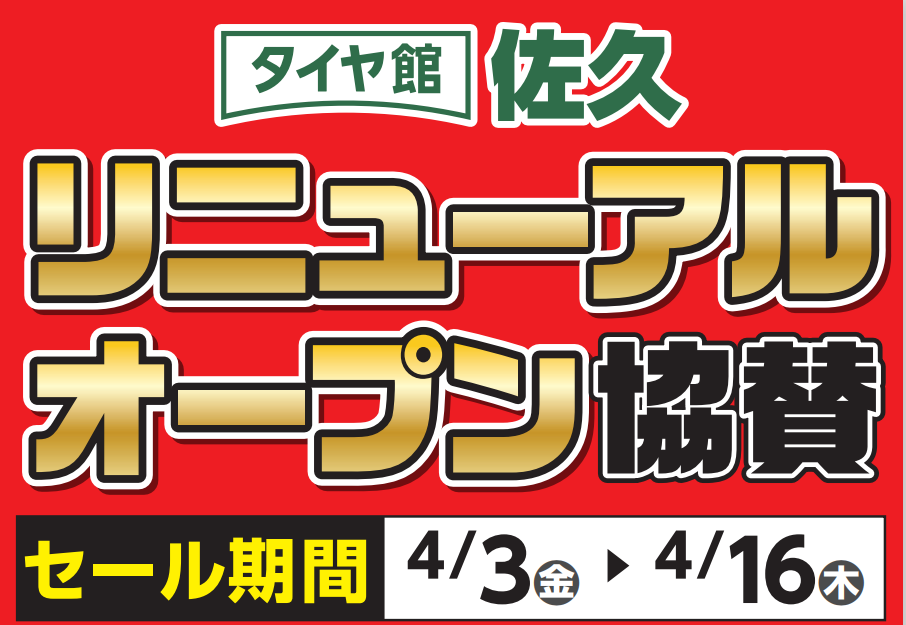 リニューアルオープン協賛セール 第2弾! ポスト 2026年4月3日 こんにちは!タイヤ館千曲です! ご好評につきリニューアルオープン協賛セール第2弾を開催します! オープンセール協賛の数量限定品もご用意しております。 夏タイヤをご検討中の方はぜひお越しください! 担当:柴﨑