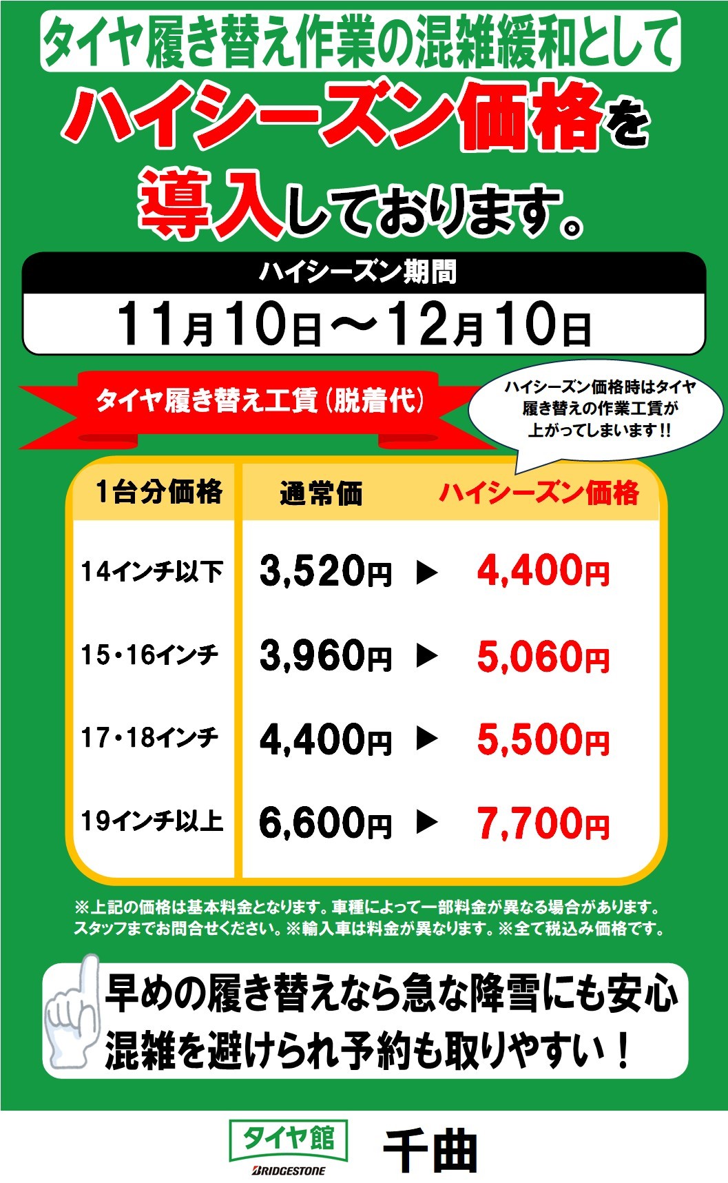 当店ではタイヤ履き替え作業の混雑緩和として ハイシーズン価格を導入しております。 早めの履き替えで安心、安全、お得です。 ご予約はお早めに! 営業時間外、定休日でもご予約可能なWEB予約もご利用ください。