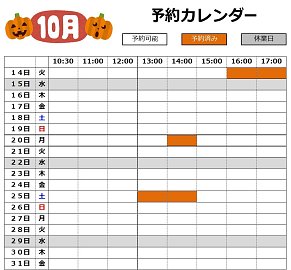 現在の予約状況です。 1週間前と比べ少し予約が増えてきました。 まだまだ予約枠の空きは多くありますが、 気温が下がるとどんどん埋まっていきますのでお早めに! お電話でもご予約は受け付けておりますが、 定休日、営業時間外でもご予約可能なWEB予約もご利用ください。