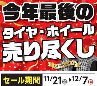 こんにちは!タイヤ館千曲です! 本日11月21日(金)~ 12月7日(日)まで 歳末総決算セール開催中です! 今年は、すでに欠品中のサイズも出てきています。 突然の降雪や急な冷え込みで慌てて駆け込む方が 増えるこの時期、欲しいサイズが欠品してしまったり お取り寄せに時間がかかる場合もござい...