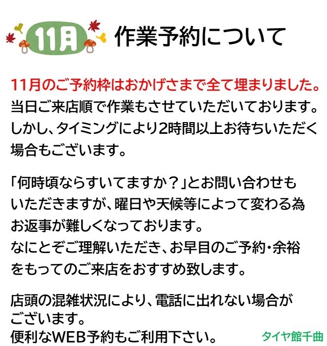 本日もたくさんのご来店ありがとうございます。 三連休の中日ということもあり、多くのお客様に ご来店いただきました。 本日、11月の予約枠が全て埋まりました。 作業の当日受付も行っておりますが ご予約の方が優先となります。 お時間に余裕をもってお越しください。