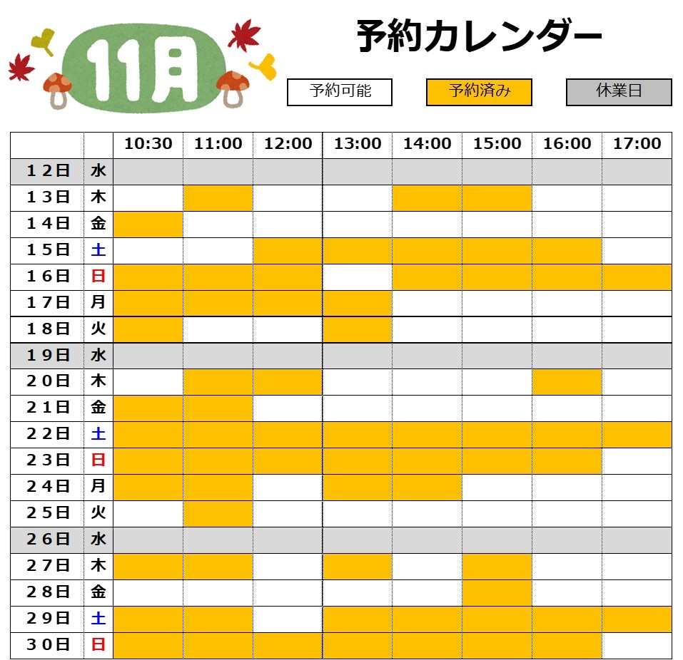11月16日の予約枠は全て埋まっております。 予約以外の当日受付も可能ですが 状況によってはお時間をいただきますので お時間に余裕をもってのご来店をおすすめいたします。 週末は予約が埋まっていますが 平日はまだ空きがありますのでお早めに!