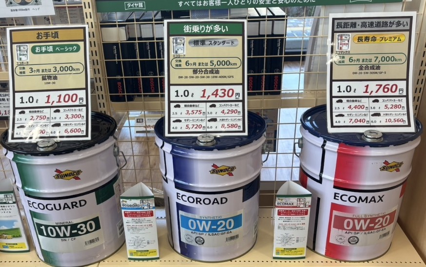 タイヤ館千曲では、お車の使い方に合わせて 選べる3つのエンジンオイルをご用意しています。 エコガードは、価格が安く、近所への買い物や通勤など、 短い距離をよく運転する方におすすめのオイルです。 交換目安:3,000km エコロードは、燃費もよくエンジンにもやさしいタイプで、 普段の運転に加え...