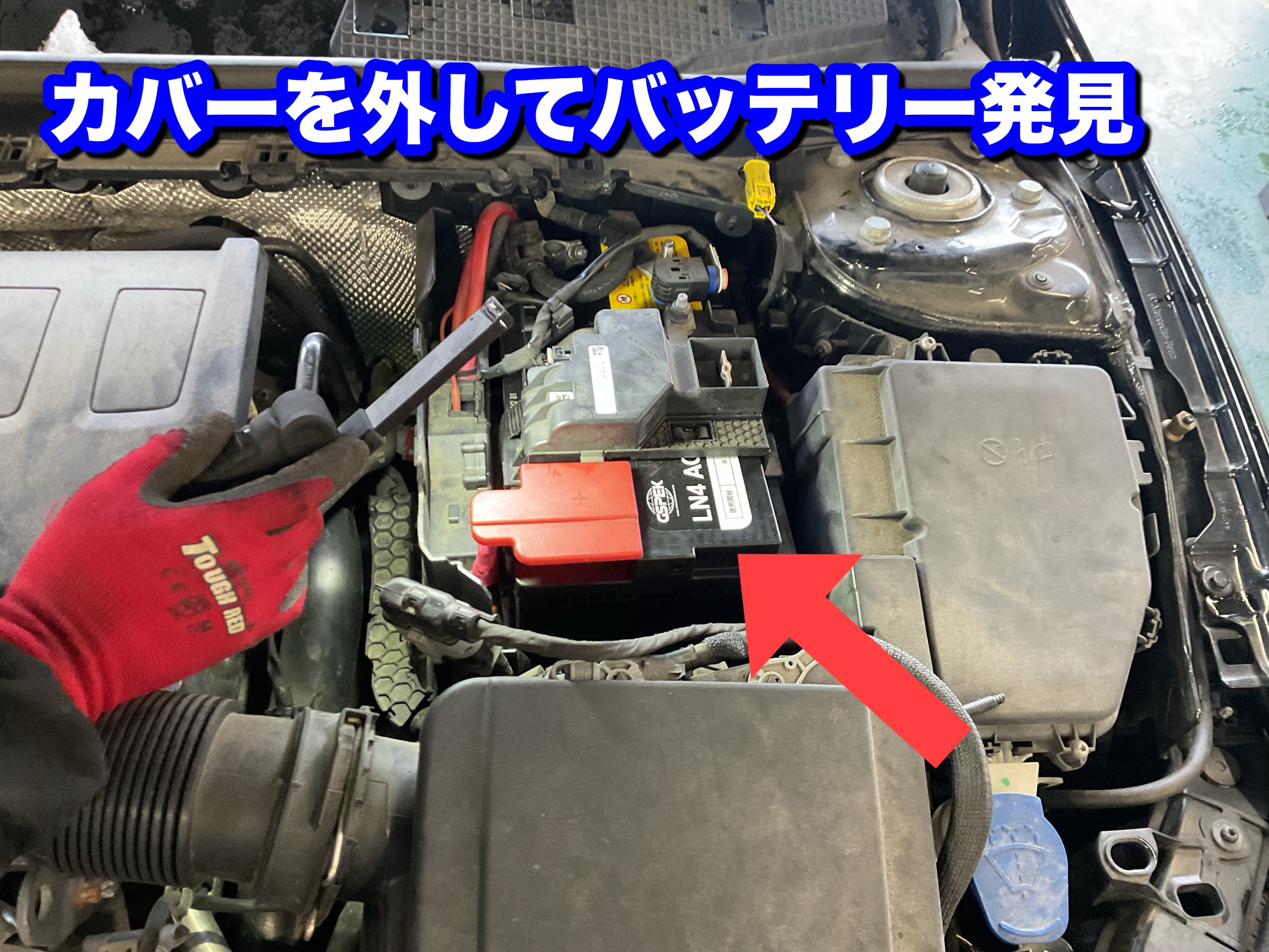 ↑ボンネットを開け、樹脂カバーを外すとバッテリーがあります。