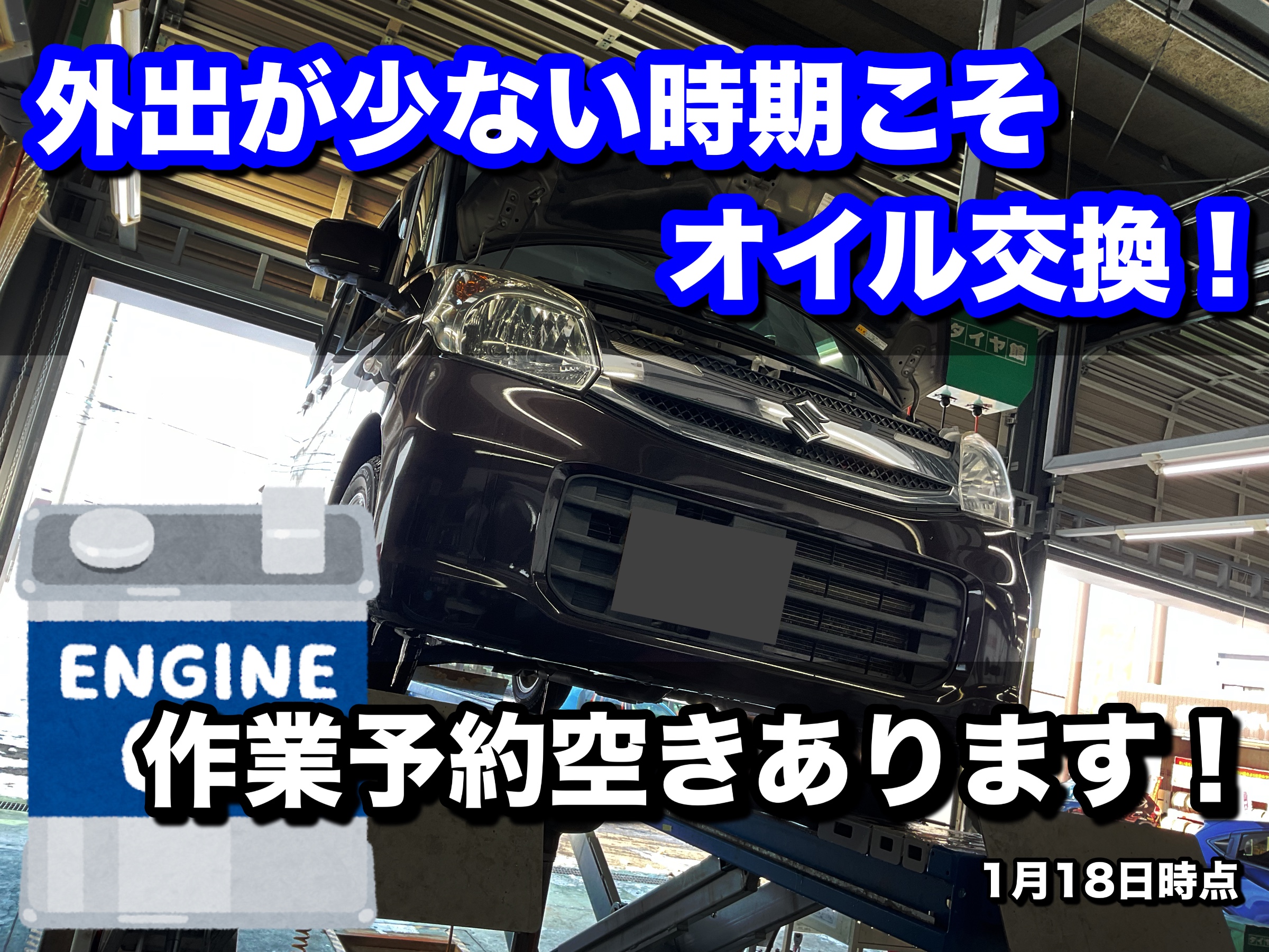 外出が少ない時期こそ!エンジンオイル交換 今なら作業予約空き有り!