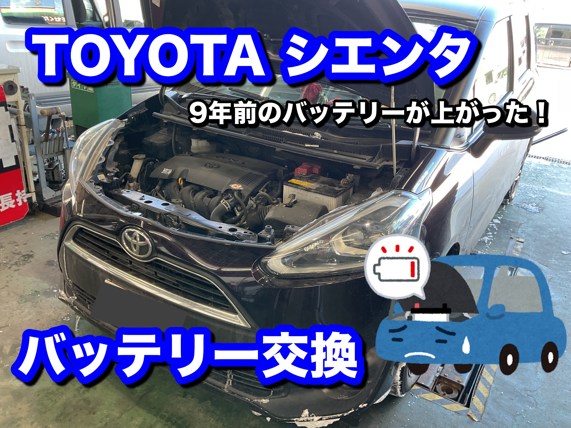今回はバッテリーが上がってしまい毎日ジャンプしないと走れない、というシエンタの駆け込み作業です。