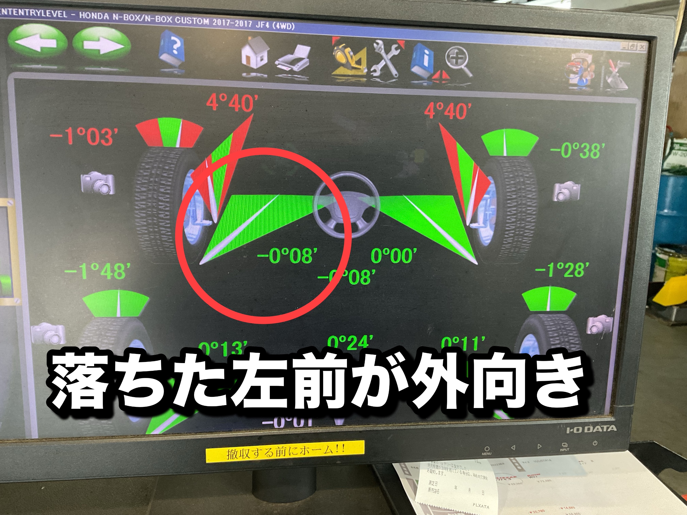 落下した左前のタイヤが基準よりも少し外側にずれていました。