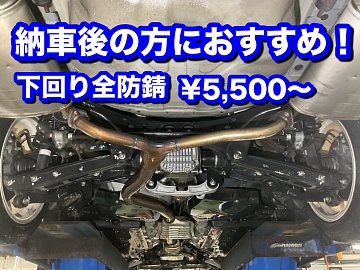 こんにちは、安藤です。 車を新しく購入された方には、防錆施工がおすすめです。 車屋さんにお願いされる方も多いと思いますが、タイヤ館でも防錆施工はできます! 少ない出費で済ませてしまいたい方には、透明の防錆剤がおすすめです。 作業料金は、軽自動車5,500円、普通車6,600円、ミニバン・SUV...