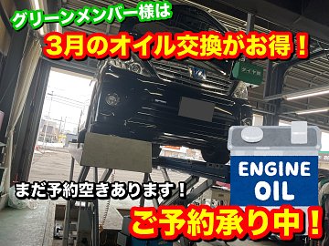 こんにちは、安藤です。 当店にてタイヤをご購入いただいたお客様は、 グリーンメンバー様としてエンジンオイル交換の割引があります! 3,6,9,12月はいつでもオイル交換がお得! タイヤ交換シーズンを目前に控えておりますが、現在作業予約はまだ空きがあります! このお得な期間にぜひタイヤ館...