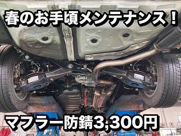 こんにちは、安藤です。 雪が解けたと思ったらまた少し降りましたね。 タイヤ館では防錆施工も実施しています!特に、購入されたばかりのお車にお勧めです! マフラーの錆止めは3,300円で承ります。 1度の施工で半年~1年持続します。定期的にやっていただくと効果的です。 現在作業予約も空きがあ...