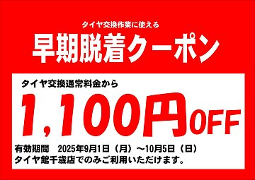 こんにちは!荒木です。 9月ももう終わりに近づいてますね。。 気温も低くなって寒くなってきているので 皆様お体にはお気をつけてお過ごしください(>_<) 冬タイヤの早期脱着クーポン配信されています! 10月5日までご利用いただけますので 走行距離の少ない方や混雑避けたい方は期間内でのお取り付...