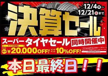 こんにちは!荒木です。 12月4日(木)から開催していた 決算セール スーパータイヤセール 本日最終日です!! たくさんのご来店ありがとうございました(^o^) まだ間に合いますのでタイヤ購入予定の方や 使っているタイヤは大丈夫?と心配な方も 是非タイヤ館千歳にご来店ください(*'▽')♪ 皆様のご来...