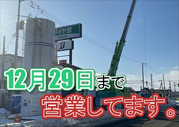 おはようございます!澤田です! いつもタイヤ館千歳をご利用いただきありがとうございます! ただいま店舗前では大掛かりな工事のため 道路から店舗が見えにくいですが。。。 12月29日まで営業しています!!! 重機などで店舗入り口が見えにくくなっておりますので ご来店の際はお気を付けくださ...