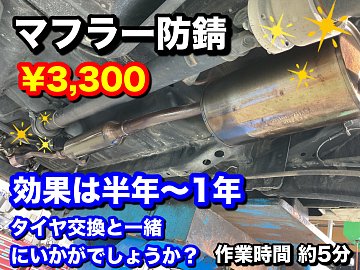こんにちは、安藤です。 タイヤ交換のついでにマフラー防錆はいかがでしょうか? 無色透明の防錆剤をマフラーに塗布する作業です。 作業料金は車種を問わず3300円! 効果は半年~1年なので定期的な施工がおすすめです!作業時間も5分ほどでできちゃいます! 履き替えシーズンの今、錆び対策も一緒に...
