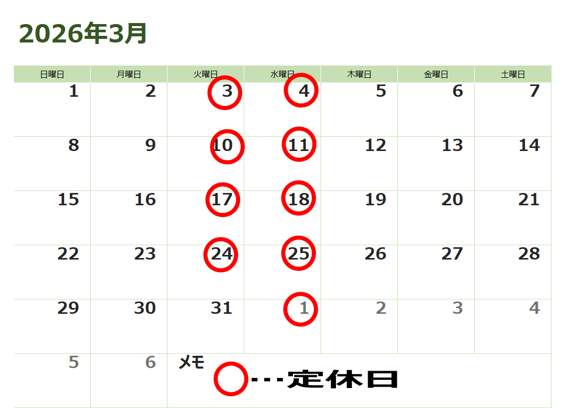 4/1(水)は定休日です。