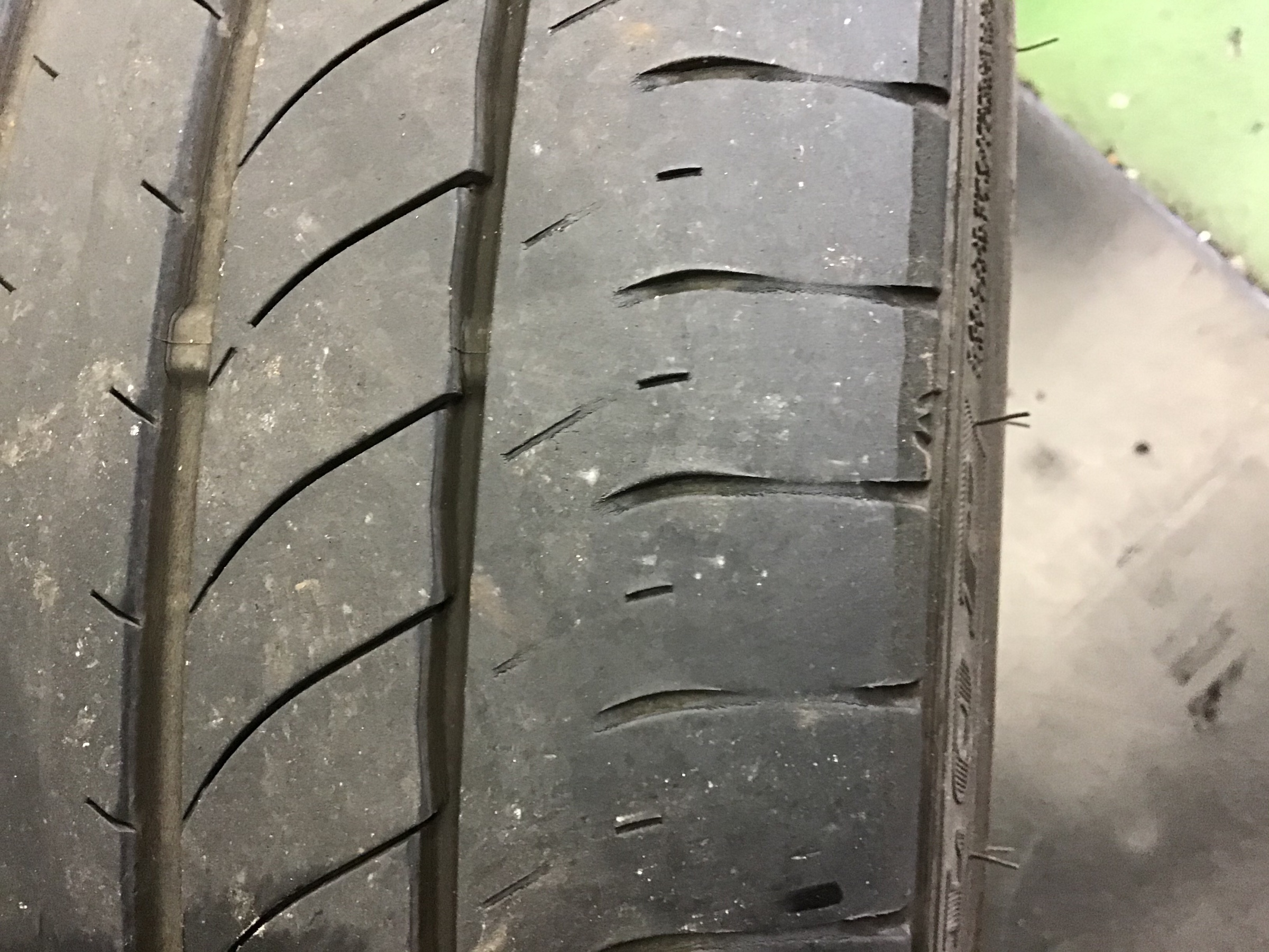 画像2は交換前の右リアです。右側が内側です。内側べりしていましたので念のためにタイヤ交換後アライメント調整しました。