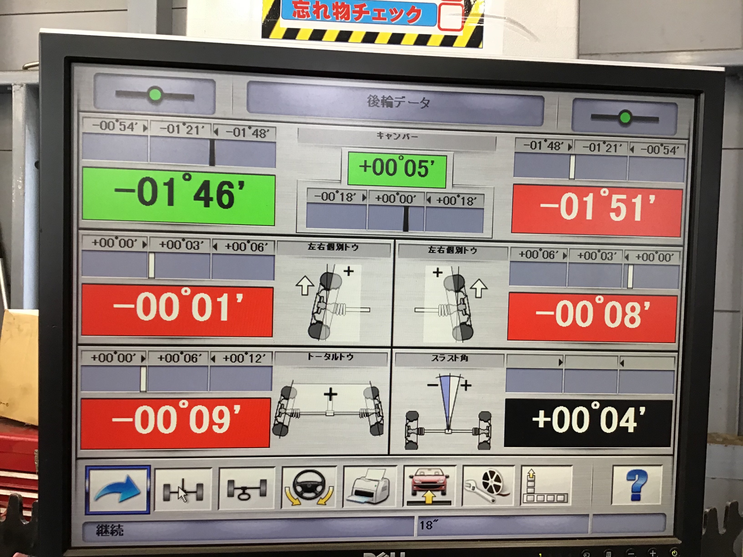 画像3は調整前リアのデータです。左右共に基準値よりトゥーアウトでした。内側べりした原因は、トゥーアウトだった可能性が高いです。キャバーも少し基準値からずれていましたが、調整ができないクルマの為調整できませんでした。タイヤ長持ちの為にもトゥーを適正値に調整しました。
