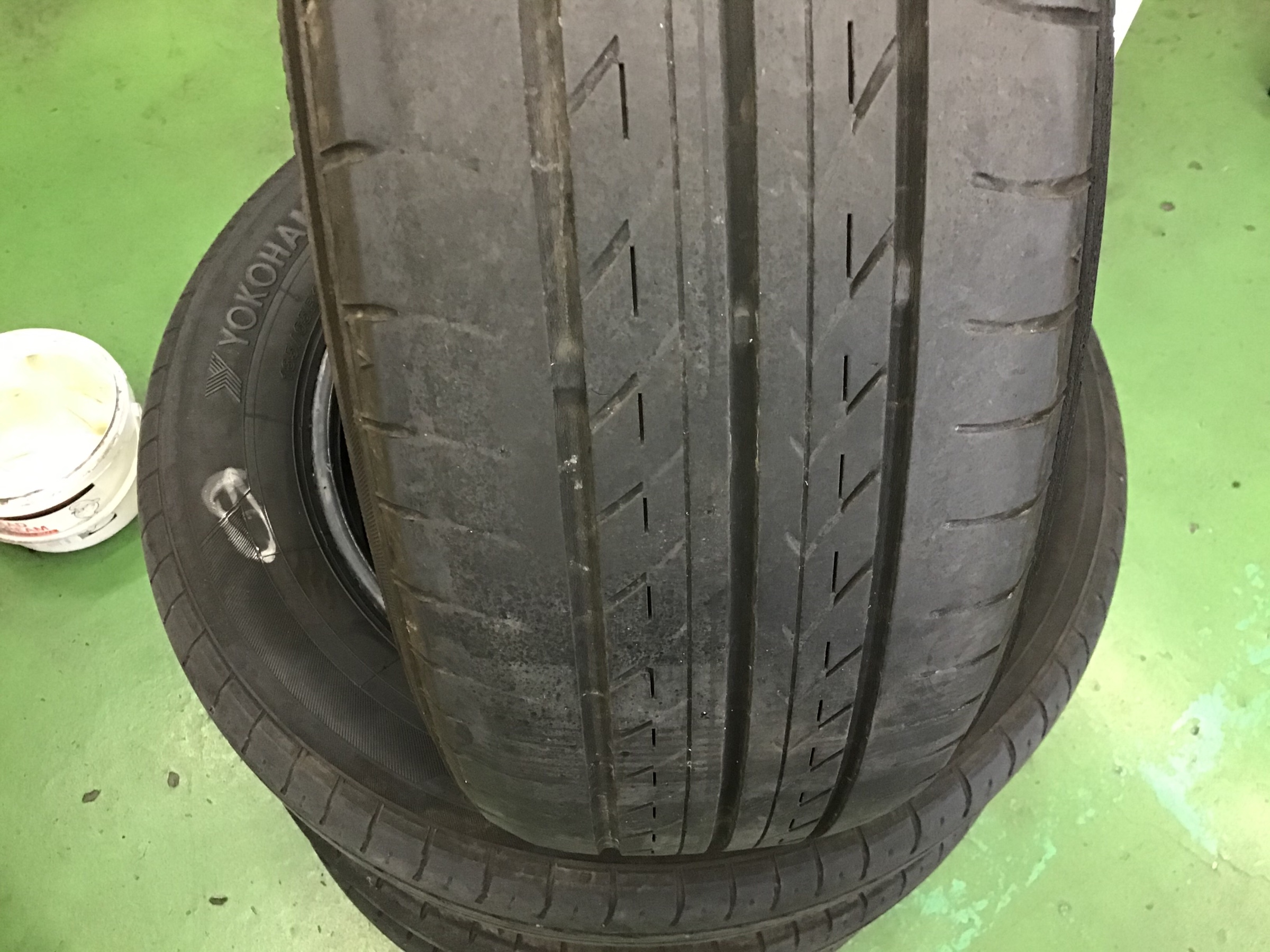 画像の左側がタイヤ内側です。4本共に外側に比べてよく減っています。