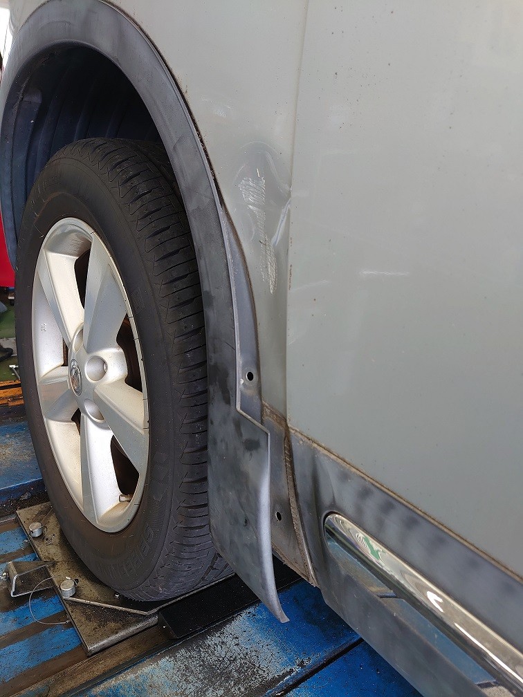 フェンダー内も内張りがタイヤの方へ押されておりました。