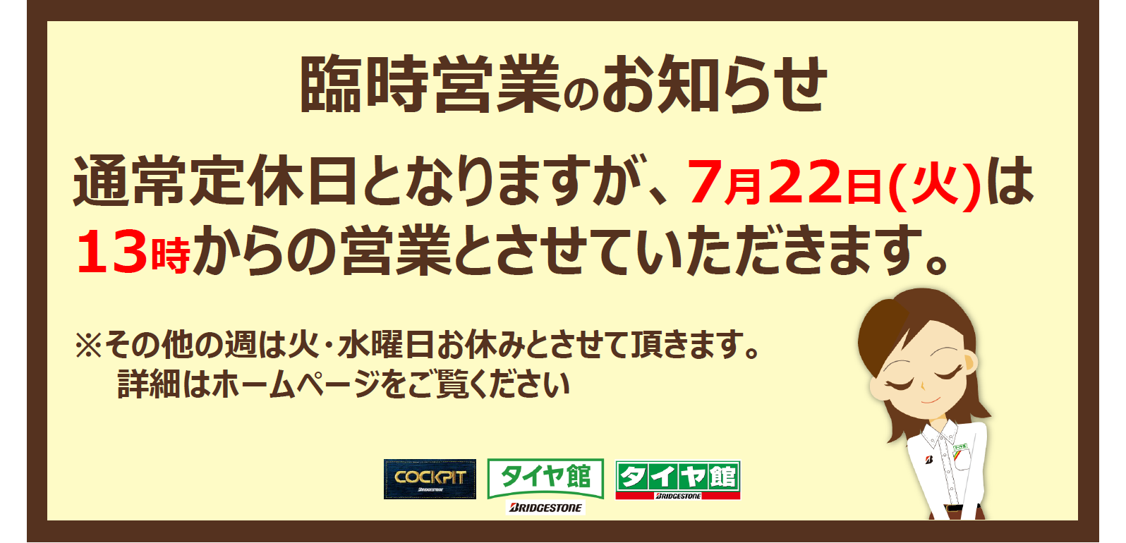 7/22 (火) 開店 13:00 になります。 ポスト 2025年7月21日 7月の営業日 8月 営業日 タイヤ館 調布 住所:182-0022東京都調布市国領町4-41-6 電話番号: 042-442-1505 相談予約 カテゴリ:お知らせ