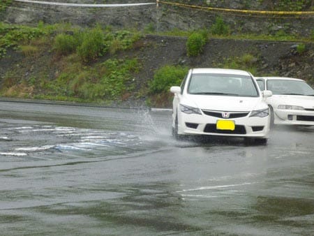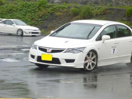 サーキットは、朝から生憎の雨模様。[写真参照:まだ水溜りが残っている所も]