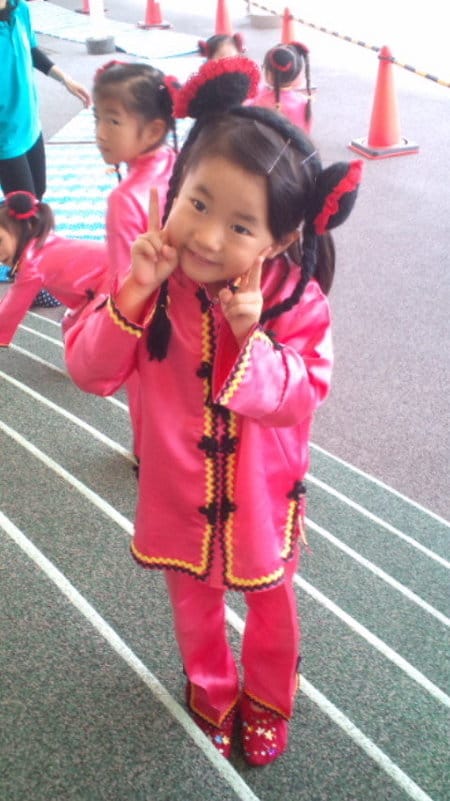 チャイナの格好がとっても愛らしく、ふわふわの扇子(ジュリアナみたいな)をひらひらさせて、上手に踊れてました(親バカ目線で)☆