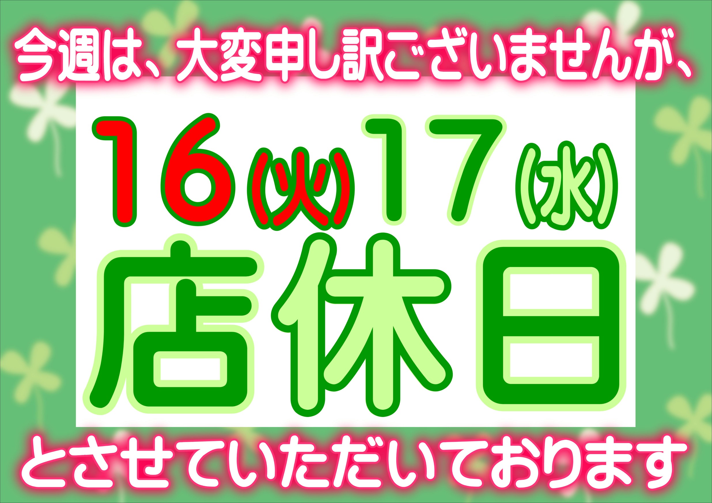 5/16(火)・17(水)は定休日となりますのでよろしくお願いします