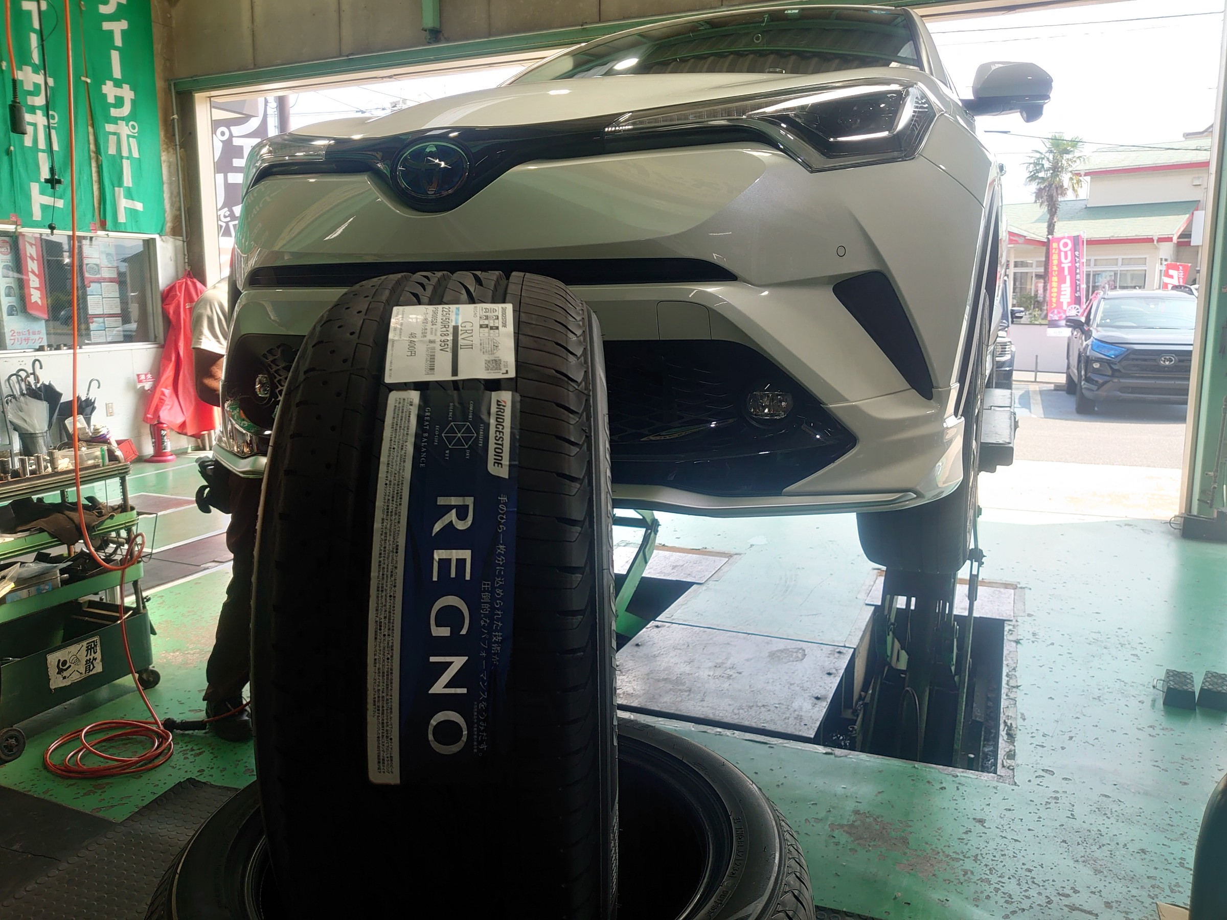 取り付けさせていただくタイヤはブリヂストンのレグノです。C-HRはタイヤ選びがおきゃくさまのニーズに応じて選択肢が結構変わることが多いです。
