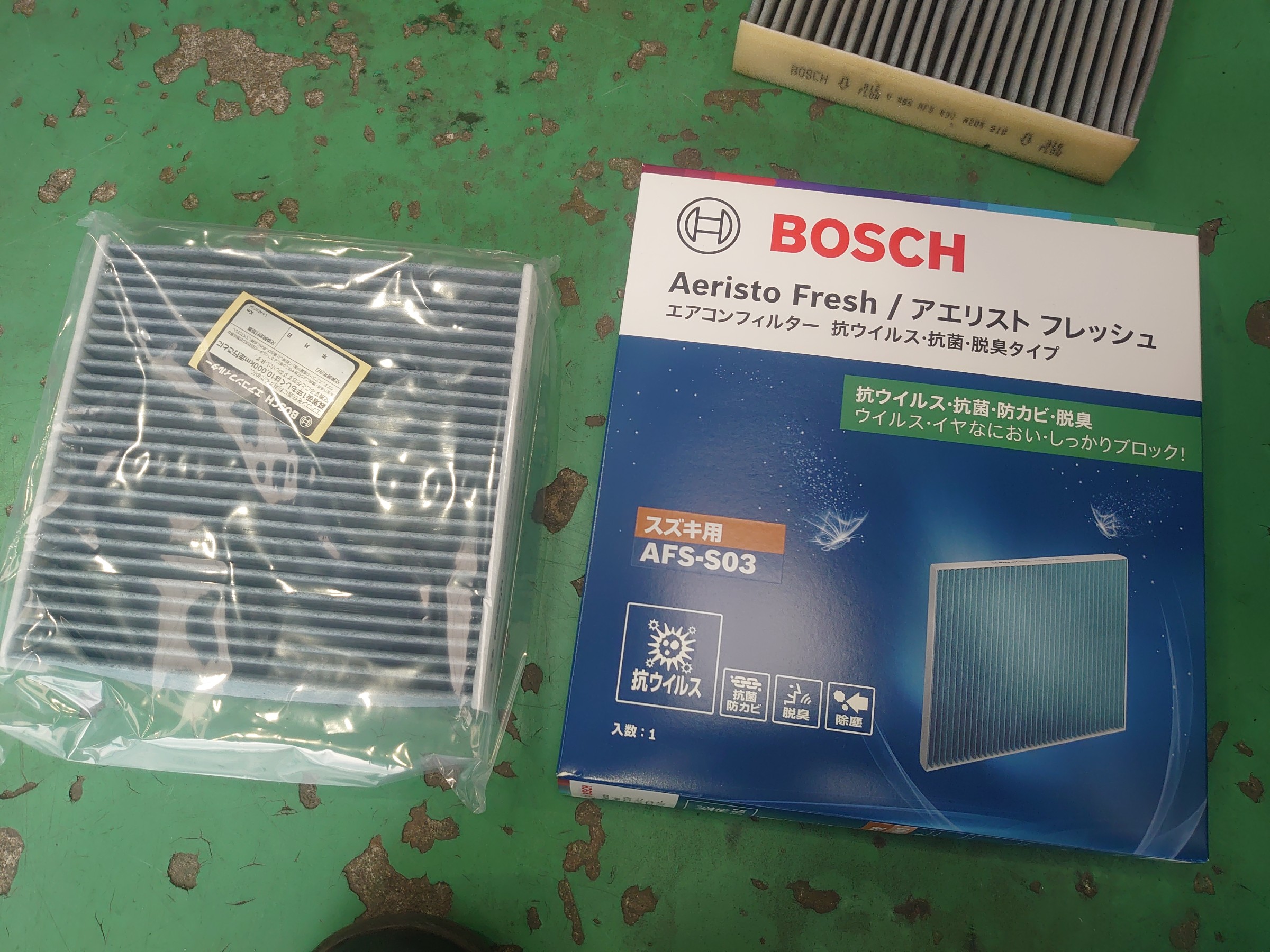 今回ご紹介のエアコンフィルターはボッシュのエアコンフィルターです。消臭抗菌タイプの商品です。