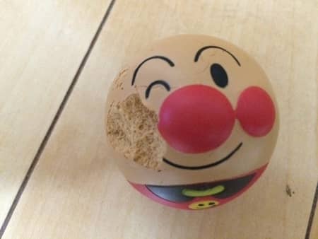 見て下さいよ! 写真のアンパンマンも娘に顔をかじられようと、