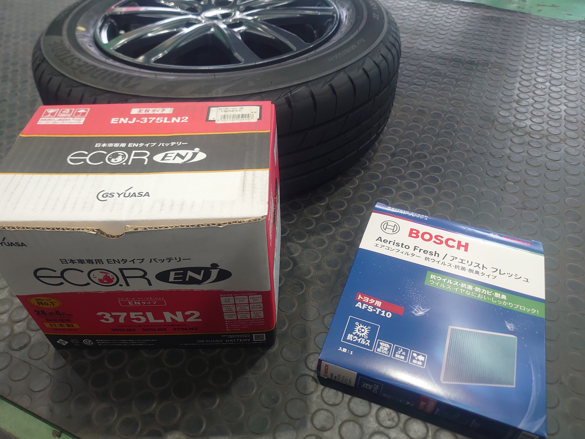 今回はタイヤ バッテリー エアコンフィルターの交換です。お車は車検にてお預かりさせて頂きました。