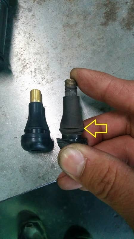 ゴム製のエアーバルブは劣化により寿命があり、通常タイヤ交換時に一緒に交換される物。