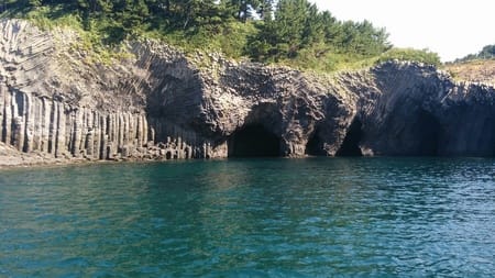 自然の力でできた岸壁の洞窟(七ツ釜)に船ごと入っちゃうんです。