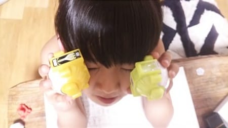 下の写真は、出目金ちゃんのまねをする上の娘です。