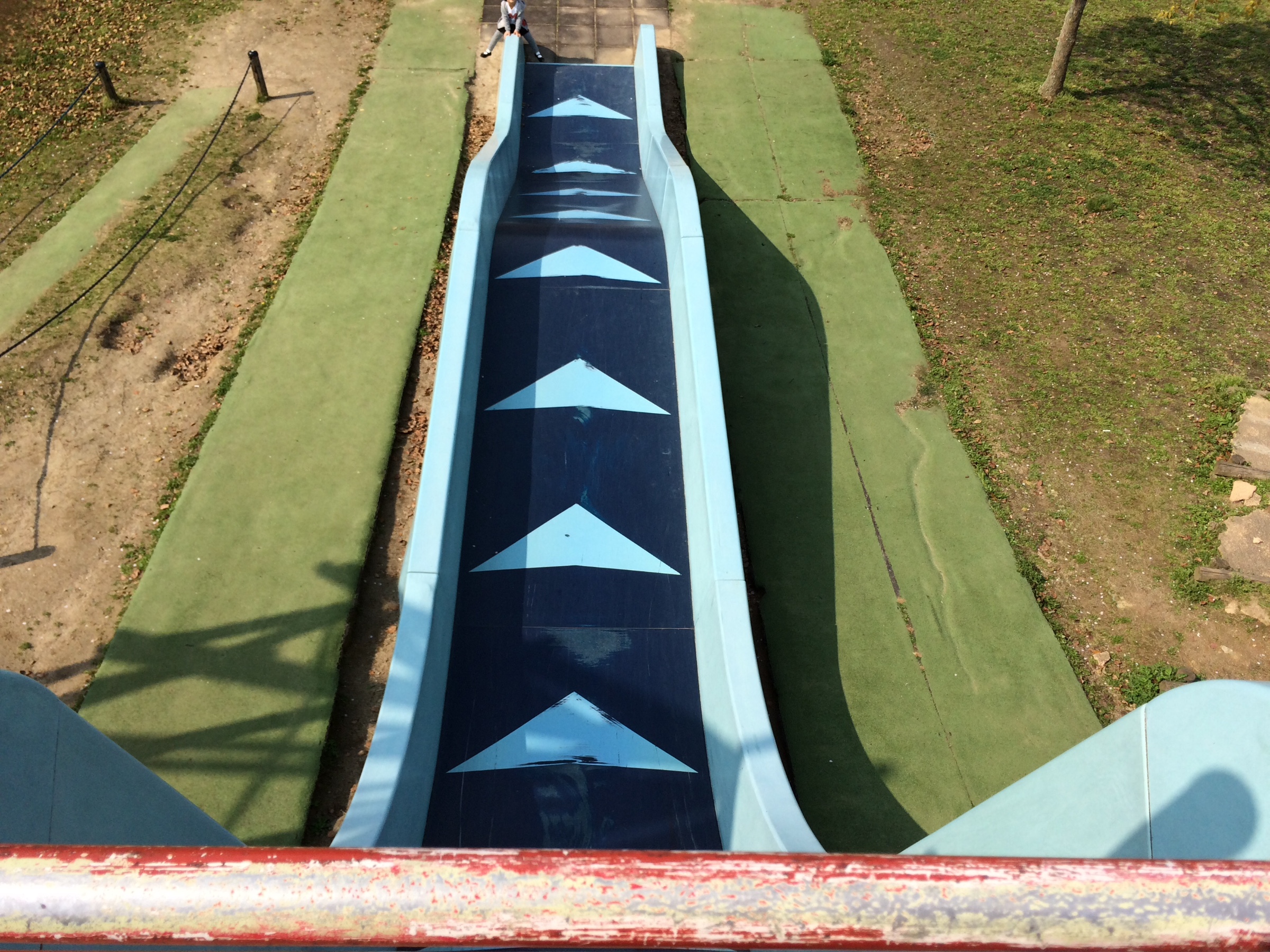 ここのは、干潟よか公園と同型の約4m落下してフラットからなだらかに滑るタイプで、滑りの良さは干潟よか公園に軍配が上がるものの高さ感は、小高い丘の斜面に設置されているのでかなりの恐怖心を煽る演出!