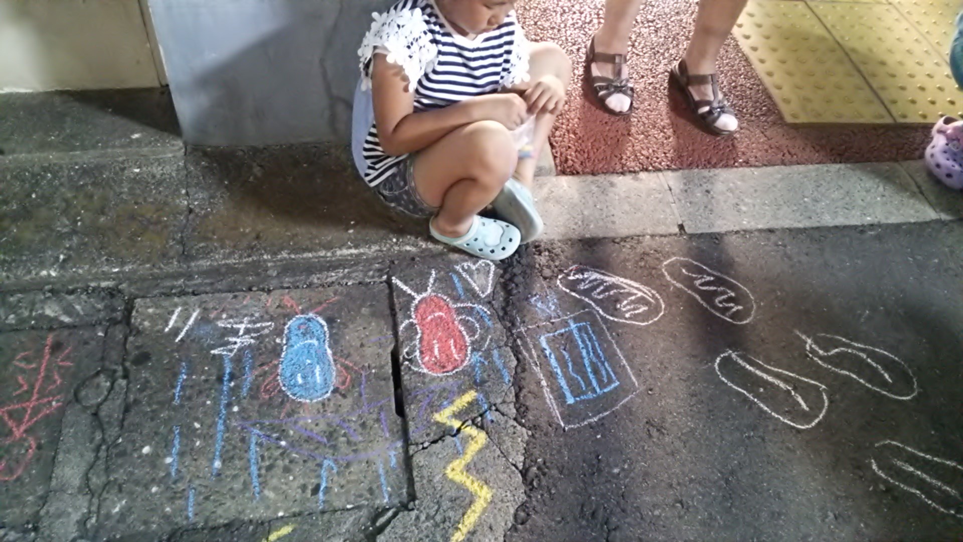 「これがいい」と、チョーク5本セットを購入し、道端にらくがきを始めました。