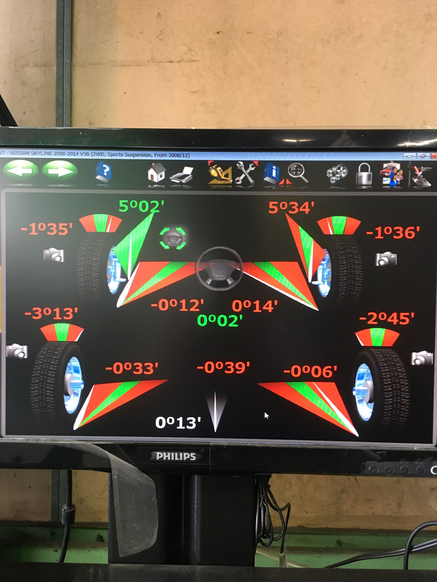 キャンバー角が基準を超えていたため、トウ角を経験に基づいて調整させて頂きましたが