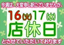 5/16(火)・17(水)は定休日となりますのでよろしくお願いします