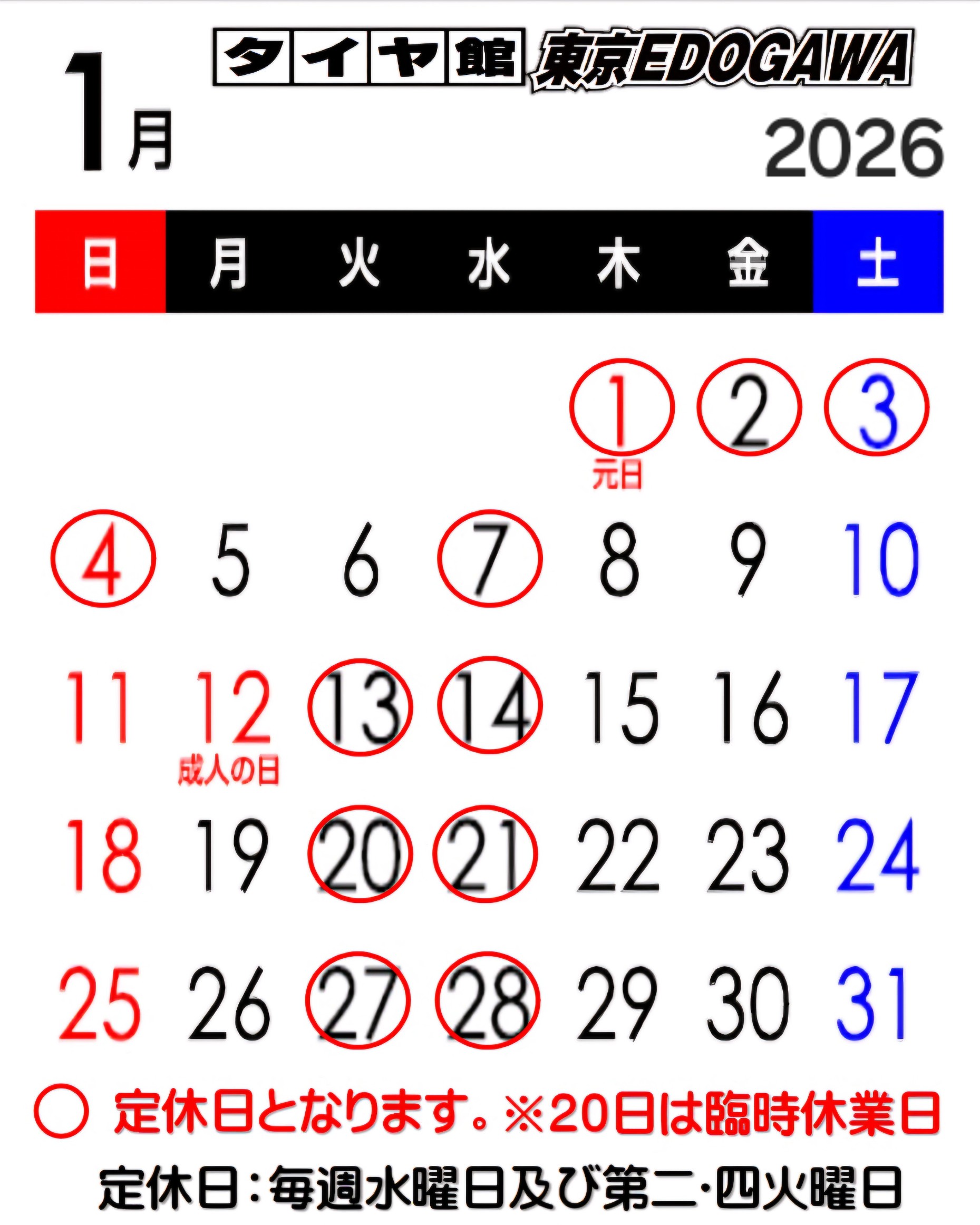 【 1月の定休日 】 2026年1月1日 いつも当店をご利用いただき、 誠にありがとうございます。 【 1月の定休日 】は以下の通りとなります。 1月もどうぞよろしくお願いいたします。 タイヤ館東京EDOGAWA 関連情報もあわせてご覧ください ■当店のインスタグラム 当店のYouTubeチャンネル