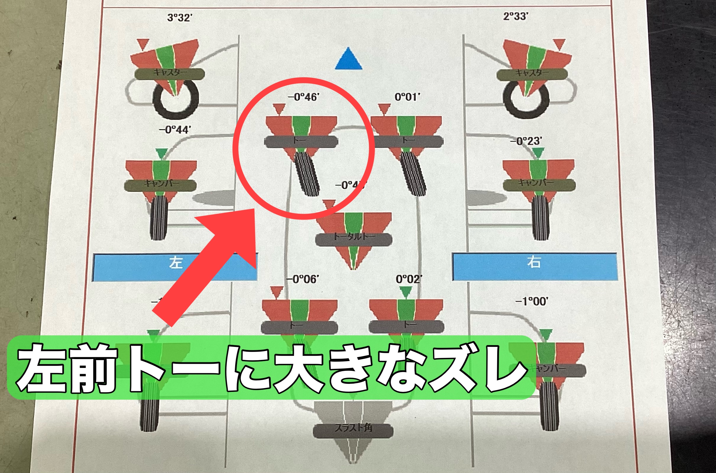 前タイヤの内減りがひどいとのご相談です。早速測定します。