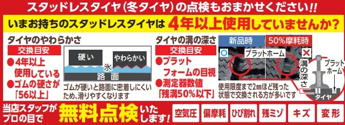 また当店では、専門知識を持ったスタッフが残り溝をチェックする残溝計や柔らかさを確認する硬度計などの器具を用いて、装着しているタイヤがまだ使えるかどうか丁寧に点検します。現在使用されているスタッドレスタイヤがまだ使用可能かどうか心配な方は、ぜひご利用くださいね。