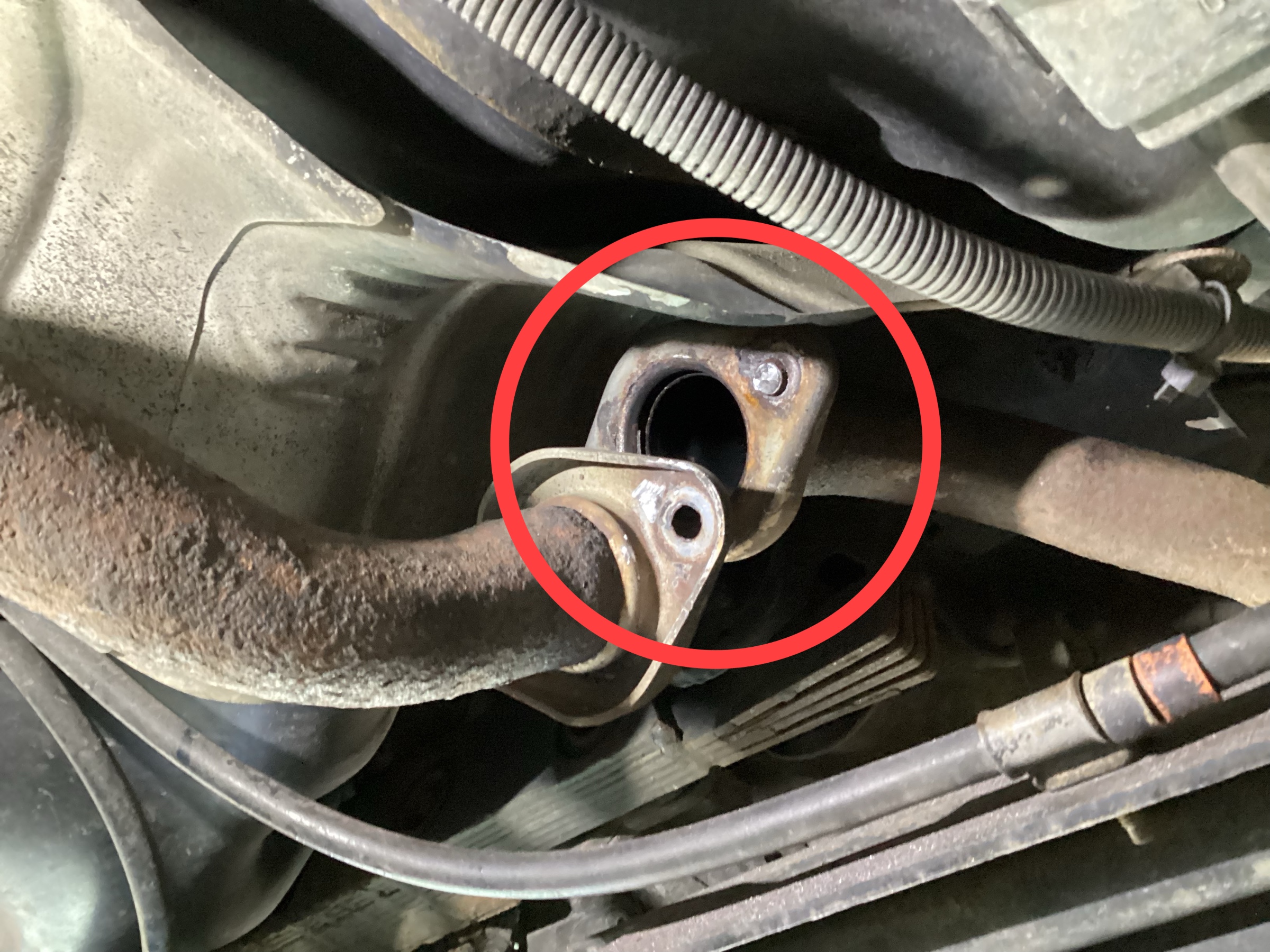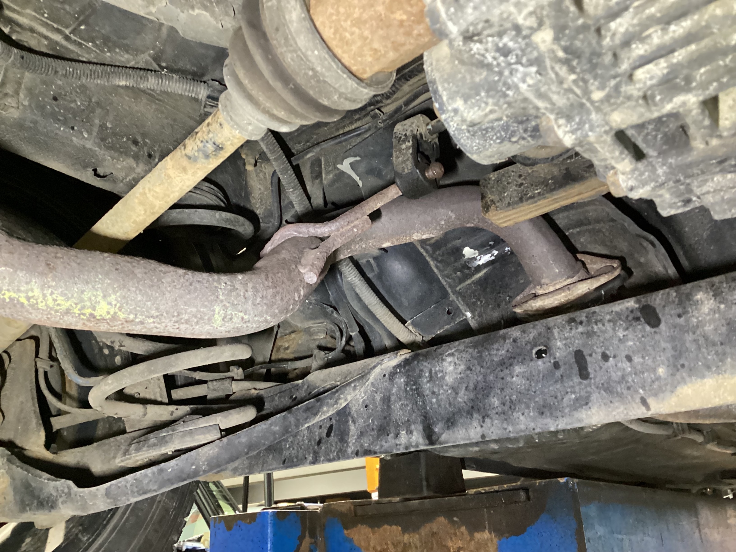 車検前の点検時には排気漏れはありませんでしたが、ゴムハンガーでマフラーを支える部分が折れそうだったので中古品と交換することになりました。
