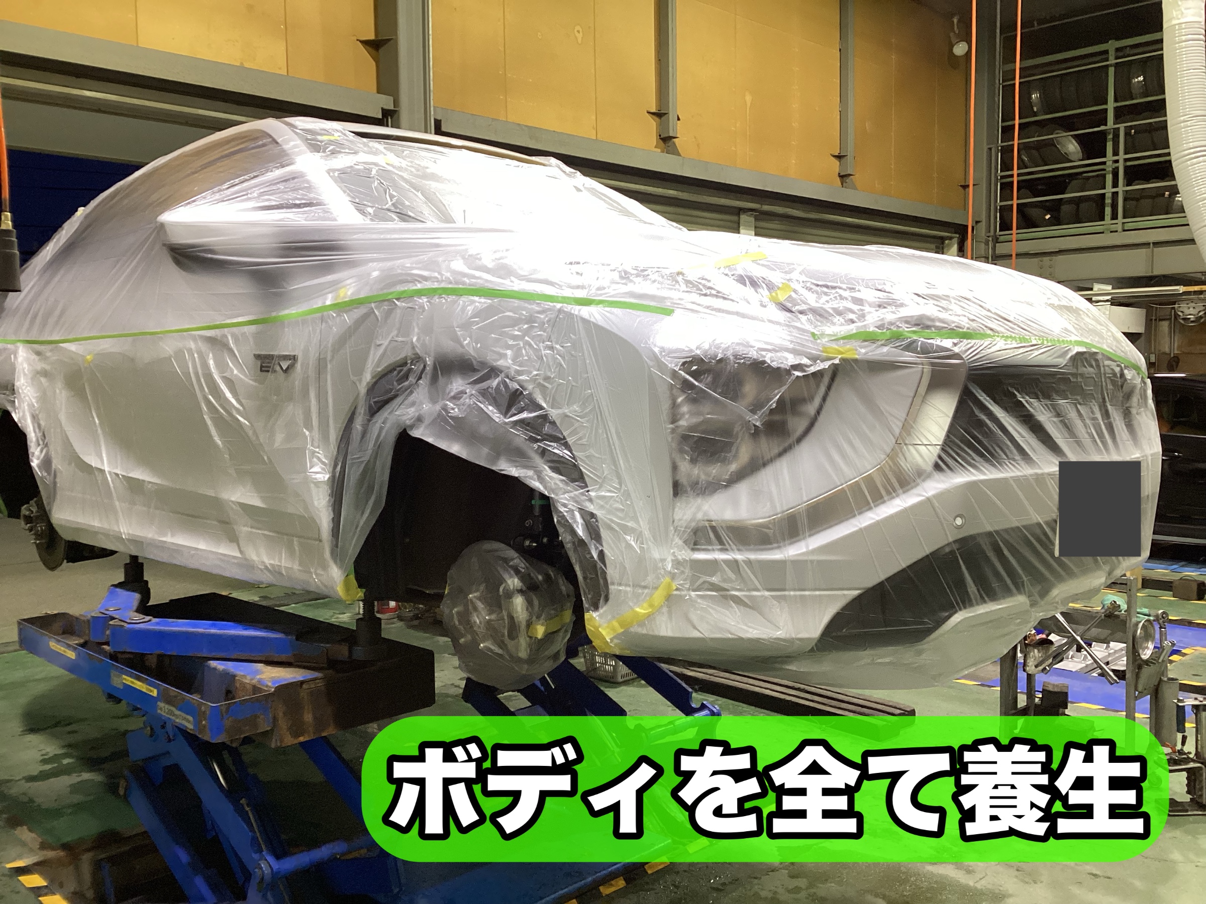 ↑下回りを洗浄して、ボディ全体を養生します。初日はここまでで日が沈んでしまいました